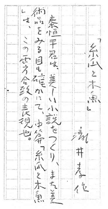 秦恒平選集より掲載 私は作家たるべく生まれてきたのではなく、ただ「私」でありたい。「私」が、作家である私の作品である。とんでもなく誤解されそうだが、あえて「闇」に、さよう「言い置く」。「私語の刻」1999年3月14日湖の本99巻『濯鱗清流 秦恒平の文学作法』 このサイトについて 秦恒平について 湖の本について 湖の本166巻 読者と共に38年 秦恒平自作を云う 秦恒平の<交響する読書> 秦恒平は毎日何冊もの、多い時は十冊以上の本を並行して読む習慣があり、それを<交響する読書>と表現してきた。(山瀬ひとみ)* 昨夜は一時までかけて十八冊の本を次々に読んでいって感じた、はじめて実感したのは、それが「音楽」「シンフオニイ」のような読後感を呉れることだった。いまドイツ、ロシア、フランス、中国、日本の文学、エッセイ、哲学、稗史、伝奇、ファンタジイ、SF、論攷、地誌、紀行などを、洋の東西、今昔を超えて読んでいるのだが、よく選んでいるので、それらが或る合奏効果から快い「シンフォニイ」のように後味になって残る。病気を忘れている。眼が正常につかえればもっともっと心地よいだろうに。「私語の刻」2012年10月12日 秦恒平の文学作法 秦恒平の思想 日本語・日本文化・日本文学 秦恒平による<機械環境文藝>の試み 「もらひ子」として 秦恒平選集より 京都人として 秦恒平選集より 歌人として 逢はばなほ逢はねばつらき春の夜の桃のはなちる道きはまれり歌集「少年」より生きたかりしにと闘ひ死にし母なれば生きのいのちの涯てまでもわれは歌集「亂聲」よりけふの日をけふのふしぎとよろこびて数重ねきし春をことほぐ歌集「閇門」より 茶人として 秦恒平選集より 知識人として 「それにしても、人間魚雷とは、悪魔の仕業のように怖ろしいことだ。それを僕達の唖の娘はつくりあげて、それに、君があれほど苦しみぬいて神のように崇高な精神で搭乗して、死に赴いたのだ。 君の手記は、その悲劇を示して僕達に警告している。僕達がまた唖の娘にそっぽを向けていたらば、僕達は崇高な精神に生きながらまた唖の娘のつくるちがった人間魚雷にのせられて、死におくられることが必ずあることを。」 ここでの「唖の娘」と「僕達」という区別は、どうつけられているのでしょうか。話の続き具合からして、「僕達」の二字には、「我々」仲間内にばかり通じて、「彼等」である他者を無視した「言葉」に酔い溺れてきたために、日本国を、混乱と不幸の戦争に導いてしまった責任有る「知識人」の意味、が預けられているのは確実です。 それとの対比で、「唖の娘」とは何の譬えなのかと、此処の所を繰り返し読みますと、「日本国民ないし日本国家」は、と含意されてあるようにも受け取れます。あるいは「思索し表現する知識人」たちは置き去りに棚上げにして、「生産する非知識人=国民」を巧妙にまた悪辣に統制・統御して、両者ともに、上から、ガンと支配した、即ち「国家・権力」のことを諷した「唖の娘」とも解釈出来ます。講演「知識人の言葉と責任 今、なぜ、芹沢光治良作『死者との対話』が大切か。」 観客として 秦恒平の有楽帖 生活者として 秦恒平選集より 秦恒平の交遊録 秦恒平選集より 死なれて・死なせて 秦恒平選集より 死の間近で 死と闘って一寸逃れに藻掻き苦しむ不安や恐怖から、人は所詮勝って逃れられるなどということは、ない。死は生の敵ではなく、生まれたその時から背後の友であった。これ以上もないほどしっかり手に手をとって歩んできた、自分自身の「影」なのでした。湖の本 107巻 バグワンと私 ―死の間近でー 「e-文藝館=湖(umi)」 英文翻訳 秦恒平作品を英文翻訳したものを掲載していきます。 秦恒平論 秦恒平選集より 秦恒平、秦恒平作品についての評論等を掲載します。 山瀬ひとみの選ぶ 秦恒平名言集 * 称讃は、百人分で一人分。(激励も含んだ)批判ないし非難は、一人で百人分と受け取るべきである。わたしが出版すれば百人の称讃はすぐにも届いてくる。批判や非難はめったなことで来るモノでない。しかし、上のように思っている。苛酷なこの事実に堪えられなくては、創作者にはなれない。「私語の刻」 2006年 3月22日 東工大「作家」教授の幸福 秦恒平選集より *** ****** *** ****** *** ******